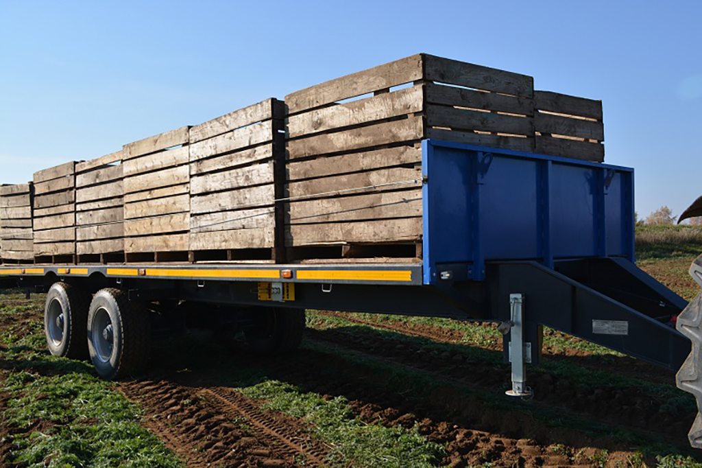 Прицеп тракторный, предназначен для перевозки овощных контейнеров и цилиндрических тюков сена (соломы).